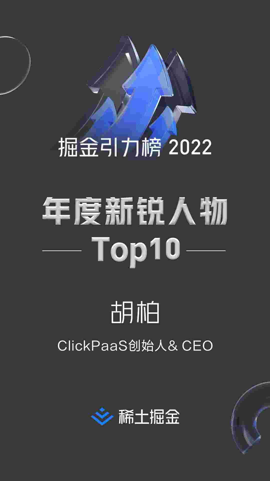 2022年1月6日,,,,,,,,稀土掘金社区第一届「掘金未来大会」成功举办,,,,,,,,,,会上发布了“2022 稀土掘金引力榜 年度新锐人物”榜单,,,,,,,上海爱湃斯科技有限公司(简称EBPAY)创始人及CEO胡柏实力入选年度新锐人物TOP 10。。。。
