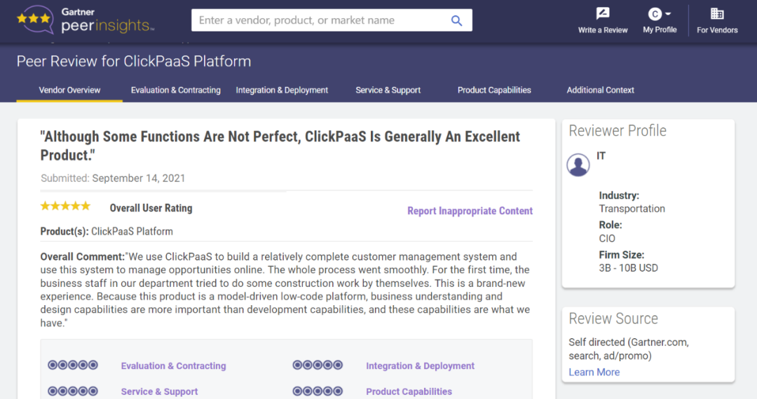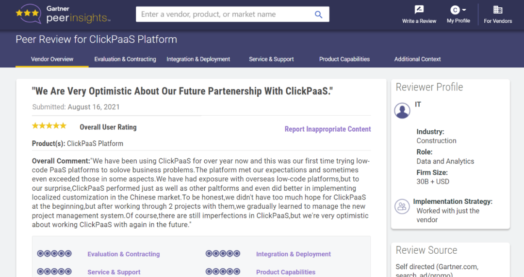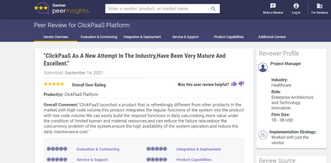 Tips:::::::【Peer Insights】——用户对企业IT产品和服务发布真实评价的平台。。。。。。。。。。。目前已有355个市场,,,,,,,,,,,,,255,000条经过验证的评价。。。。。。每一条评价Gartner会针对参评企业营收规模及参评人员信息做验证、、、、、、、评价内容做多维核实。。。。。。。。。。。